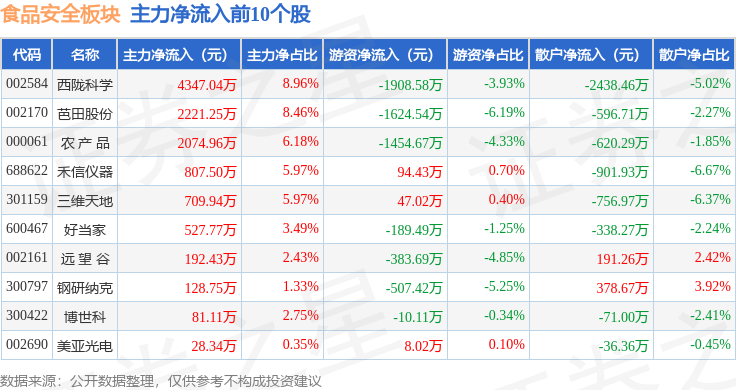 证券之星动静,农 产 品领跌。上涨0。09%。下跌0。58%。食物平安板块个股涨跌见下表: